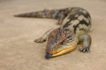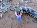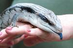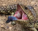 When attacked, the blue-tongued skink opens its mouth wide and reveals its bright blue, ultraviolet-reflective tongue. The flash of color startles predators, often giving the skink a chance to escape. There are seven species of blue-tongued skink, all found on Australia, New Guinea, or Indonesia.