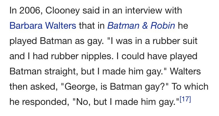 i love the wording because it implies that George Clooney personally altered the dc universe to make batman gay so now Batman is permanently and canonically gay