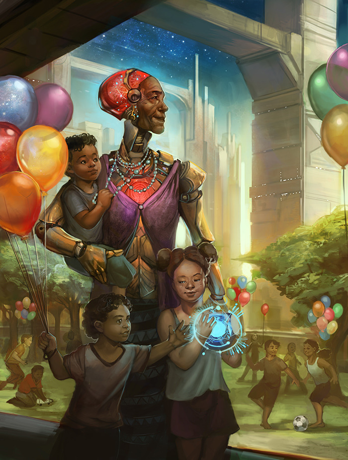 This is an illustration I did for the August 2014 issue of Popular Science Magazine. The assignment was to show a scifi take on human aging in the future. I wanted to do something relatively positive, so I drew a lady whose life has been been prolonged through cybernetic enhancements and augmentation, so she gets to spend time with her great-great-great-great grandchildren.