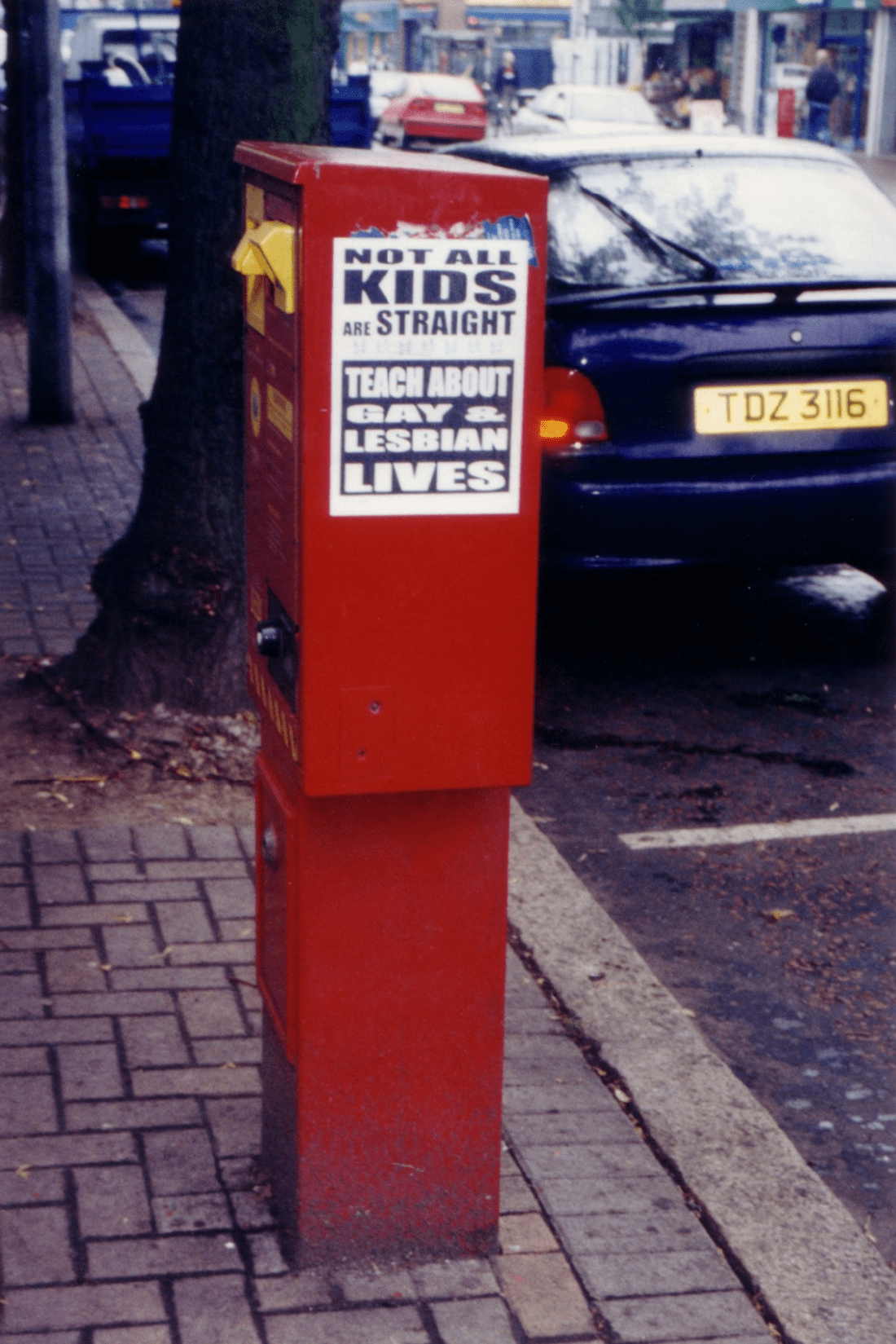“NOT ALL KIDS ARE STRAIGHT. TEACH ABOUT GAY & LESBIAN LIVES”, a poster from the lesbian avengers in belfast, ireland, photographed by maxine wolfe, 1998