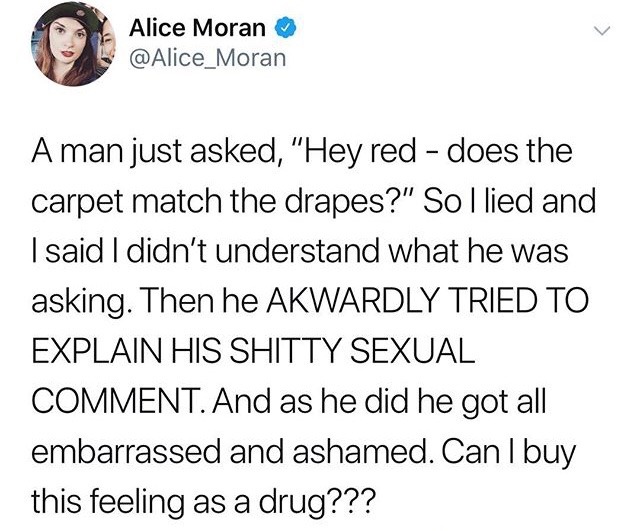 Okay, but this is an excellent method to use when anyone is being inappropriate. Pretend that you don’t get it. Whether the comment is sexist, racist, sexual, misogynistic, inappropriate, off-color… watching them squirm as they try to explain and realize just how awful their comment was it is better than being angry about it.