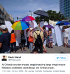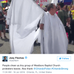 When a handful of Westboro Baptist Church members showed up Saturday at the funeral of Orlando shooting victim Christopher Leinonen, counterprotesters donning large, white angel wings were there to shield mourners. Members of the Orlando Shakespeare Theater put together the wings as a symbolic but also literal screen between the WBC and funeral attendees. An Orlando Police tweet later proved the efforts to stop the WBC worked.
